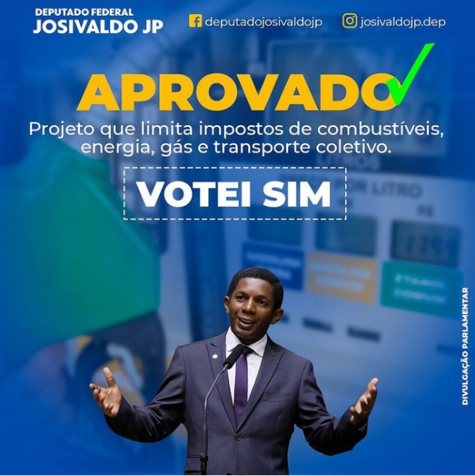 O deputado federal Josivaldo JP, votou nesta quarta-feira (25) favorável ao projeto de lei que limita impostos de combustíveis, energia, gás e transporte coletivo; o PL foi aprovado pela Câmara Federal e vai a sanção.
